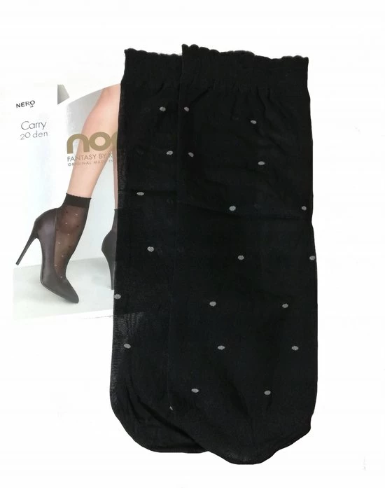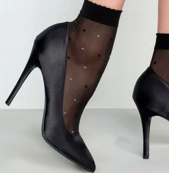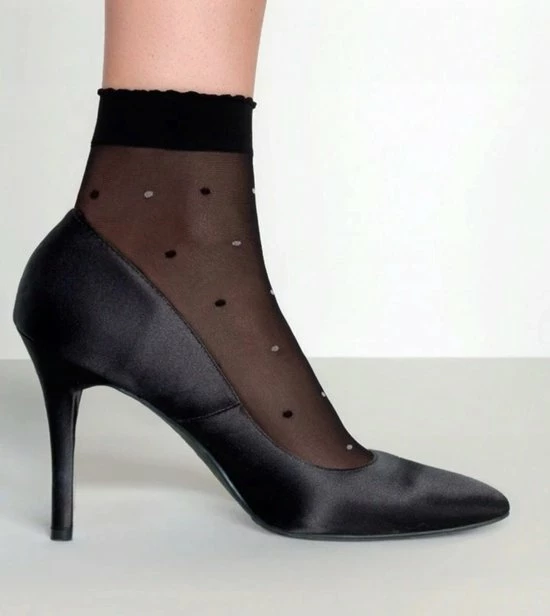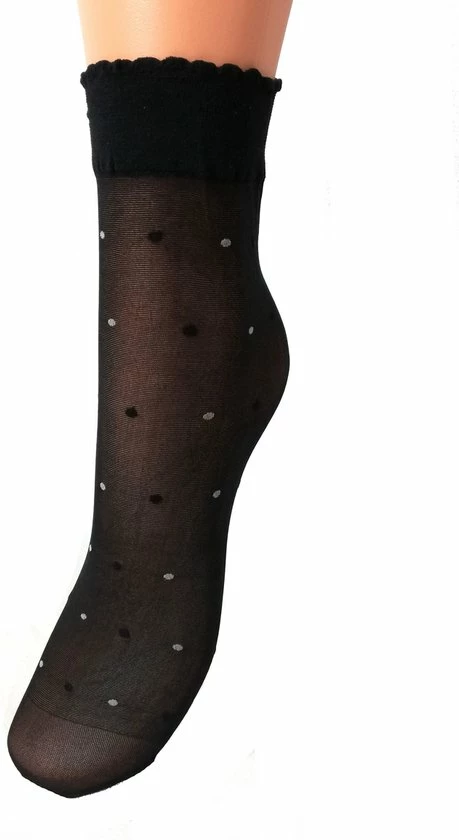 Deze 20 denier panty sokken met stippen zijn transparant met fijne dunne zwarte en witte stippen. De pantysokken zijn voorzien van een comfortabele elastische en gekarteld boordje. De tenen van de sokken zijn onzichtbaar versterkt met comfortabele platte naden. Door genoeg elasticiteit passen ze in elke schoenmaat.