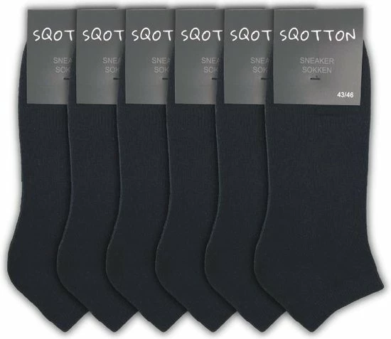 Set van 6 paar badstof sneakersokken in de kleur zwart van het merk SQOTTON. Deze sneakersokken hebben een prettig draagcomfort en zijn een ideale basic voor dagelijks gebruik of om te dragen tijdens sporten. De sokken hebben een lage boord die tot de enkel valt. Daarbij zijn de sneakersokken voorzien van een badstofvoering aa de onderkant, vanaf de teen tot boven de hiel. Hierdoor zijn de sokken vocht absorberend en licht schokdempend. Dankzij het hoge percentage katoen zijn deze sneakersokken ademend, anti-transpirerend en voelen de sokken zacht aan. De set van 6 paar sneakersokken zijn verkrijgbaar in diverse kleuren en maten.