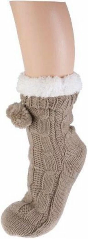 Beige huissokken voor dames. Warme comfortabele huissokken met pompoms voor dames. De sokken hebben een zachte voering aan de binnenzijde en anti-slip aan de onderzijde. One size.