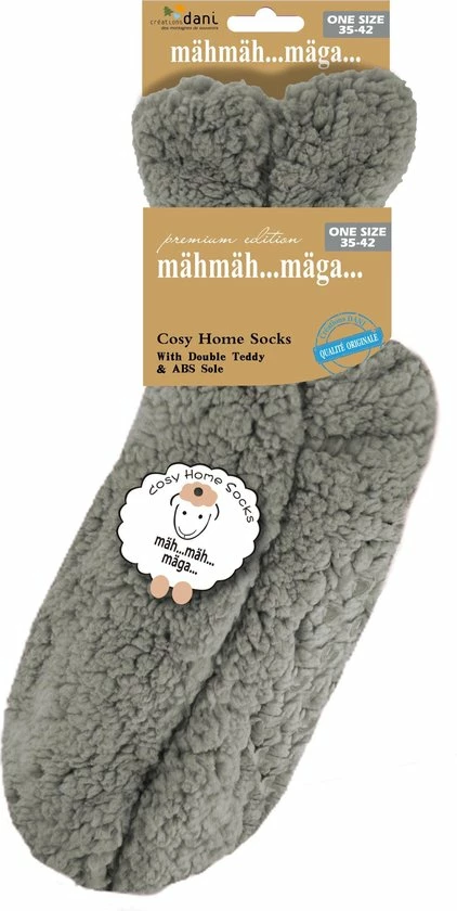 Grijze slofsokken/huissokken/bedsokken voor dames. Warme slofsokken in grijze schapenvachtmotief, dubbele teddyvoering en kunststof zool.