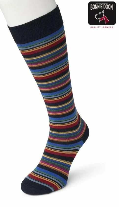 Bonnie Doon Dames Gestreepte Kniekousen Blauw/Rood/Geel Maat 36/42 – Knie Kousen – Streep Patroon – Strepen Print – Uitstekend Draagcomfort – Jersey Stripe Knee High – Kniesokken – Zakt Niet Af – OEKO-TEX – Light Navy – BP051501