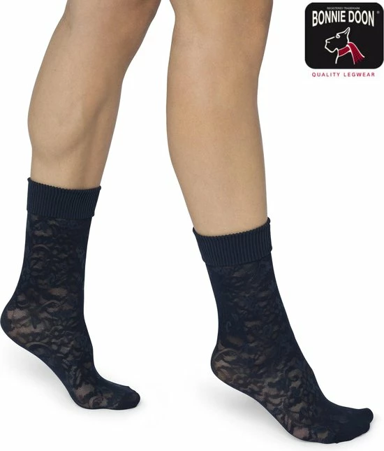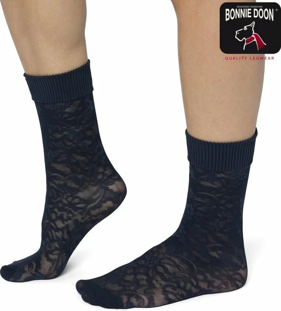 Bonnie Doon Dames Sokken Met Kant Maat 36/42 Donker Blauw – Panty Sokjes – Doorschijnende Sokken – Feestelijk – Semi Transparant – Kanten Sokken – Bloem Patroon – Uitstekende Pasvorm – Flower Sock – Donkerblauw – Navy – BP201101.2