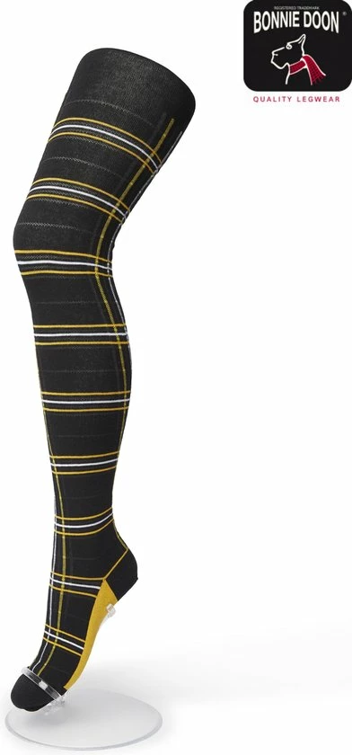 Bonnie Doon Maillot Dames Met Ruiten Zwart/Geel Maat L/XL – Ruit Motief – Ruitjes Print – Biologisch Katoen – Uitstekende Pasvorm – Bio Cotton – Gladde Naden – Checks Tights – Heerlijk Comfortabel – Sulphur – BP211901.5