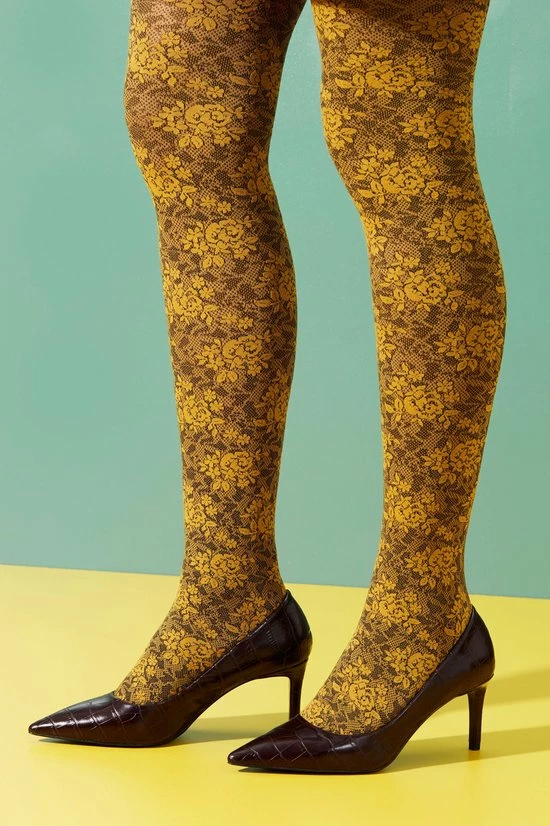 Mooie 60 denier dames panty met gelaagd kantachtig bloemmotief. De panty is verkrijgbaar in verschillende kleuren.91% polyamide, 9% elastane, 60 denier
