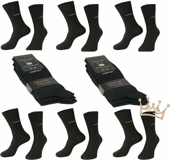 “Comfort socks” 75% katoenen sokken zonder die vervelende voelbare teen naad en anti transpiratie. Deze sokken hebben net zoals medische sokken een wijde boord maar zakken niet af. Leverbaar in de maten 39/42, 43/46 en zelfs in maat 47/50. Deze set sokken bestaat uit 6 paar nette naadloze Comfort sokken, ook wel wijde boord sokken genoemd. 6 paar zwart. Deze sokken zijn sokken met een perfecte pasvorm en een wijde boord, zodat de boorden uw been dus niet af knellen, ze zijn extra wijd en dus voor mensen met bijvoorbeeld zwellingen, diabetis, oedeem, reuma of circulatie problemen. Deze sokken hebben een zeer goede prijs/kwaliteits verhouding. Mede door dat ze in een voordelig 6Pack worden geleverd kunnen wij deze prijzen hanteren. Deze sokken zijn al jaren een vertrouwd product met vele tevreden klanten.