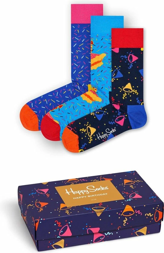 Geleverd in een mooi versierde geschenkdoos met daarop feestelijk attributen. De giftbox bevatten 3 paar Happy Socks die allemaal op geheel eigen wijze versiert zijn. Een super leuk cadeau om te geven of te krijgen! De sokken zijn helemaal in een feestelijke stijl met printjes van confetti, taart, slingers en feestmuts.