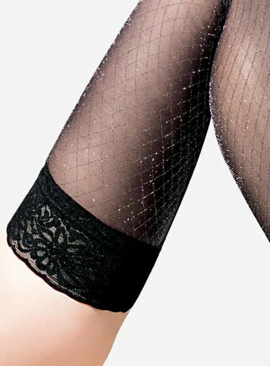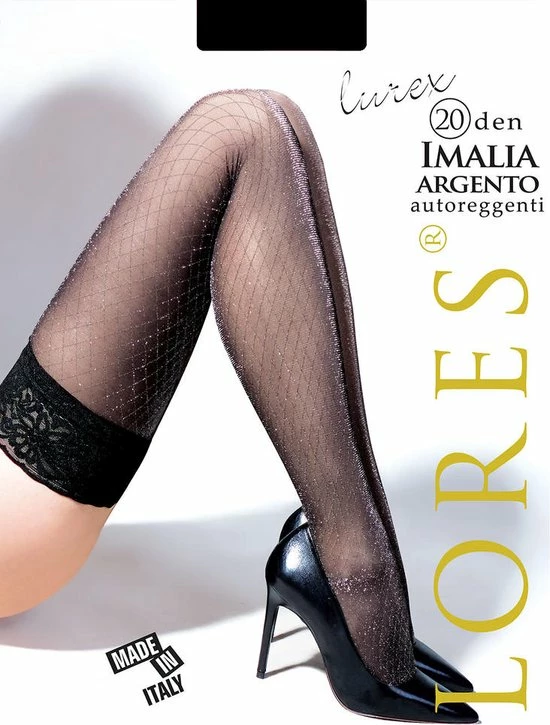 De Imalia lurex is een elegante kous met een mooie patroon van lurex garen, waardoor een prachtiger glinsterend effect ontstaat. Een fijne comfortabele kanten band van 9 cm aan de bovenzijde die met behulp van de silicone strips zorgt voor extra comfort en een stevig gevoel tijdens het dragen. De hold up zal niet snel afzakken en blijft goed zitten. Leuk om te combineren bij een effen jurkje en een paar mooie pumps. Sla je slag en ga voor de verleidelijke look en laat je benen stralen.
