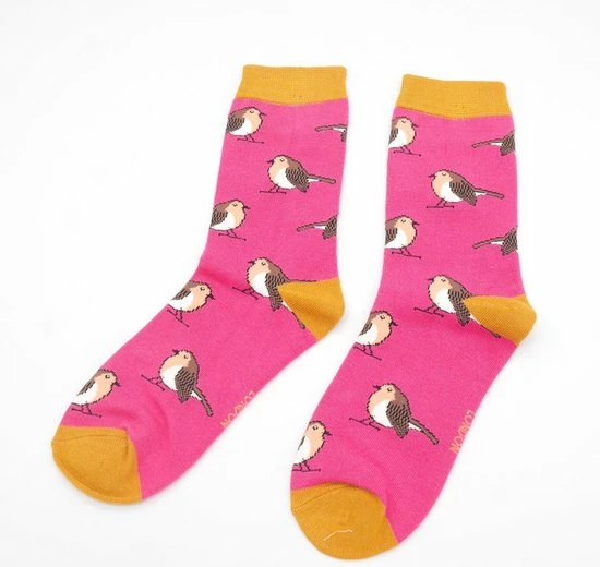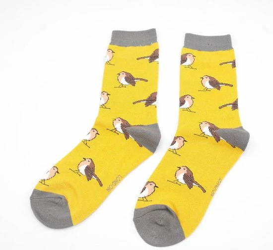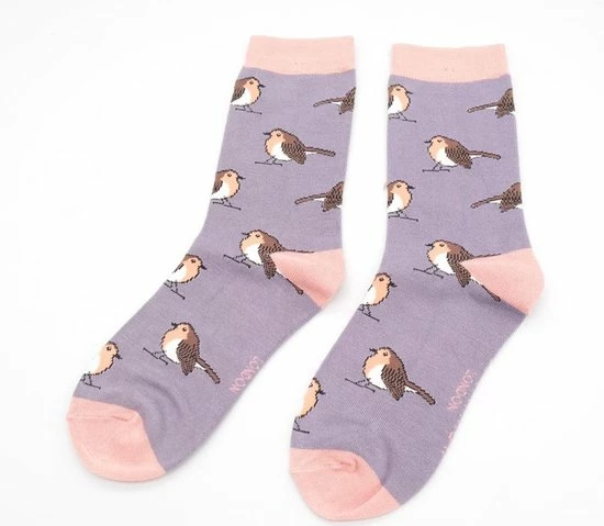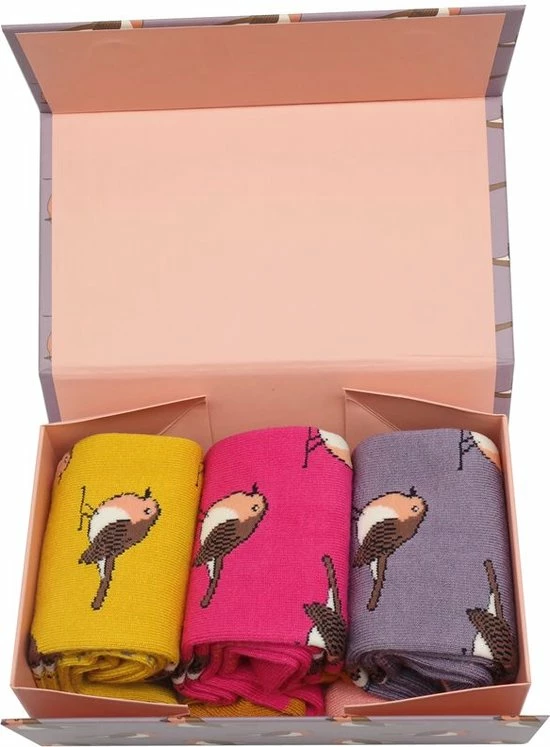 Drie paar mooie bamboe damessokken in cadeaudoos van het merk Miss Sparrow. In de cadeaudoos zitten verschillende kleuren sokken met een roodborstjeprint. Sokken zijn altijd een mooi cadeau om te geven of om zelf te krijgen. De sokken hebben een goede pasvorm en voelen superzacht aan.