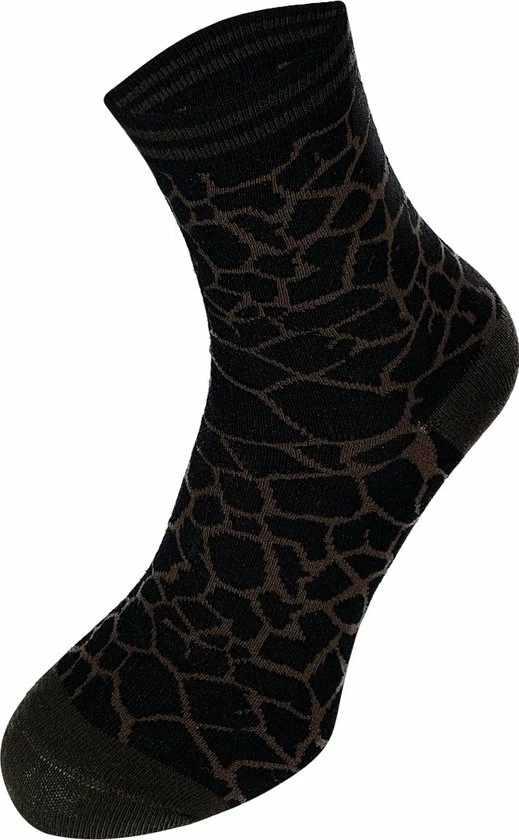 Dames sokken dierenprint. Deze sokken set bestaat uit verschillende dierenprintjes. Dankzij de subtiele zwarte en bruine kleuren zullen deze sokken niet volledig afleiden van je outfit, maar ze geven net een beetje extra detail. De sokken zijn erg comfortabel omdat ze geen voelbare teennaad hebben en ze werken anti-transpirerend dankzij het hoge katoen percentage. Samenstelling: 72% katoen, 26% polyamide, 2% elastaan.