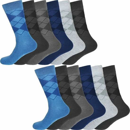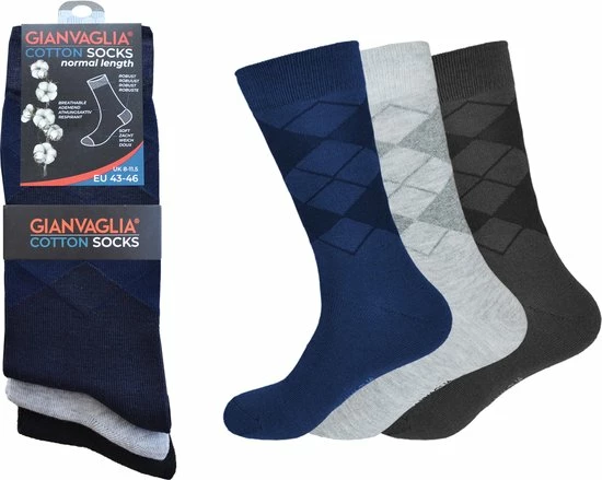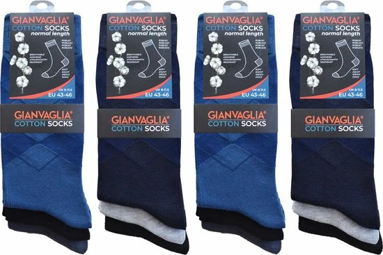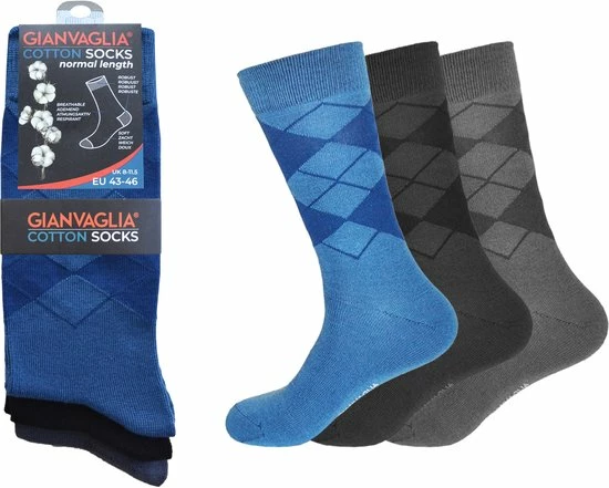 Gianvaglia sokken, voordelig geprijsd en van top kwaliteit. Deze sokken met ruitmotief en verschillende kleuren (blauw, grijs en zwart) zijn de vrolijke must-have voor iedere wardrobe. Nu verkrijgbaar in een voordelige 12-pack waar u een tijdje vooruit kunt. Unisex dus voor beide dames en heren.