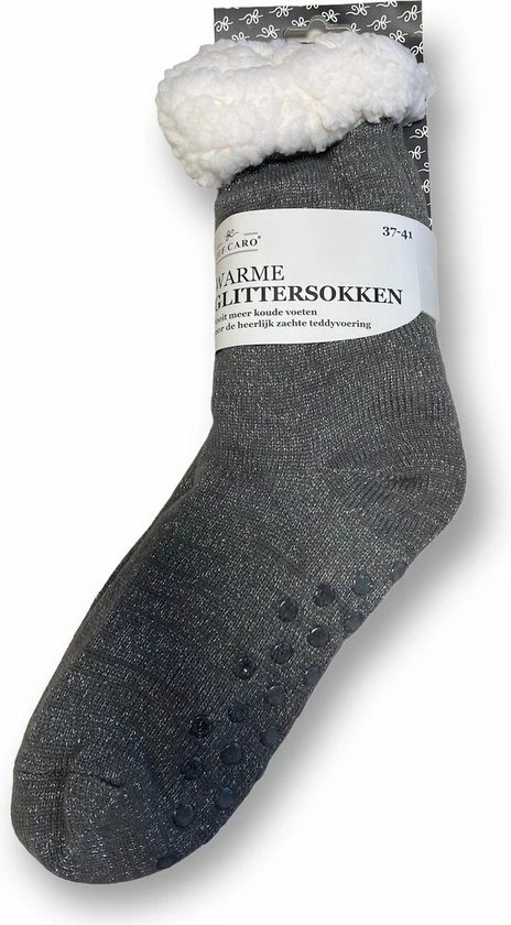 Merkloos Warme Antislip Glittersokken – Kleur. Grijs – Maat. 37 / 41 – Gevoerd Met Imitatie Bont – Altijd Warme Voeten