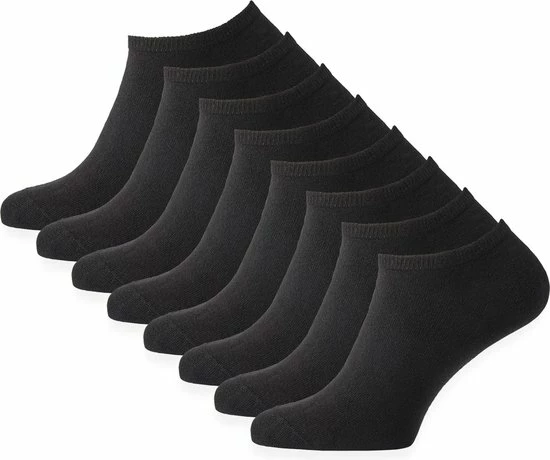 Deze set bestaat uit acht paar zwarte enkelsokken, gemaakt van katoen en elasthaan.