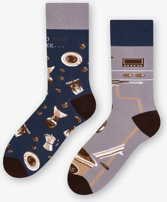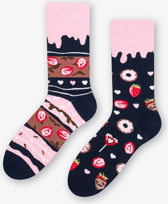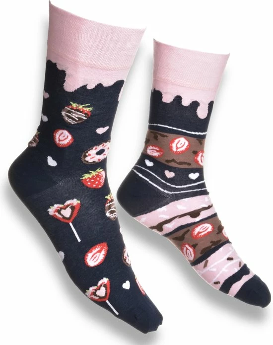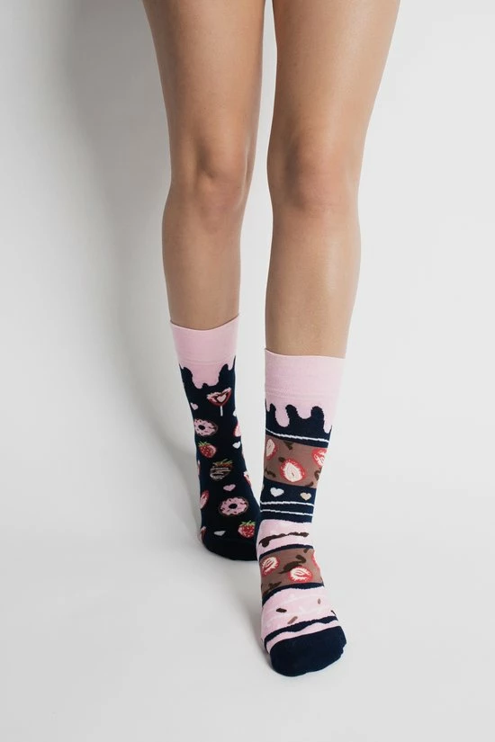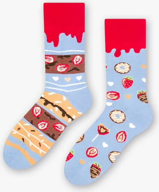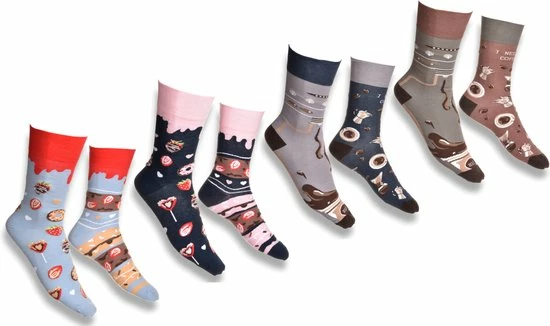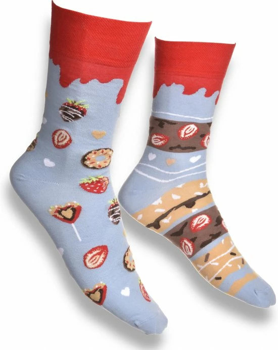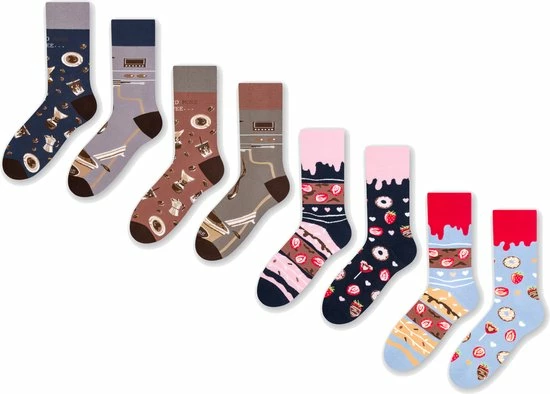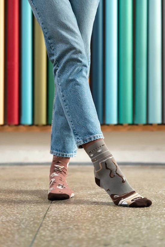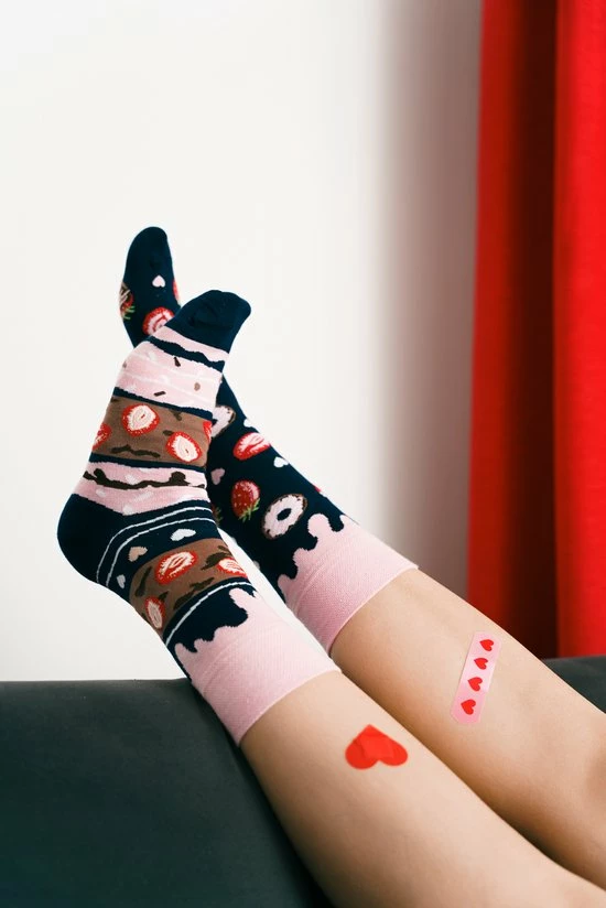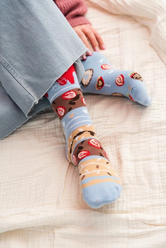 De sokken hebben een asymmetrische print, wat met andere woorden betekent dat de linker sok anders is dan de rechter, maar ze passen net zo goed bij elkaar als een taart bij een kopje koffie.