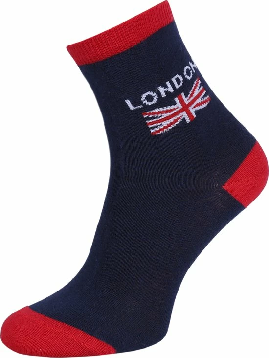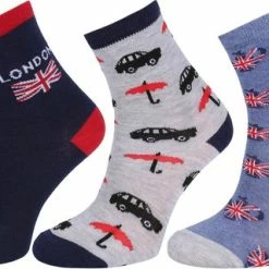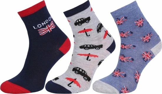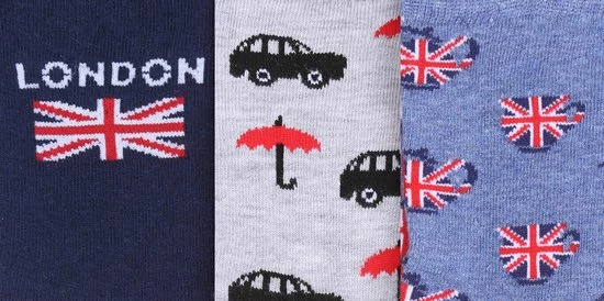 Een set van drie paar hoge sokken met terugkerende symbolen gerelateerd aan Groot-Brittannië.