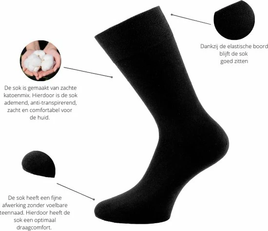 Hoge kwaliteit naadloze sokken van het merk SQOTTON in de kleur zwart. De sokken zijn gemaakt van een zachte katoenmix en hebben een uitstekend draagcomfort. Dankzij het hoge percentage katoen zijn de sokken ademend en anti-transpirerend. Ideaal voor als je last hebt van zweetvoeten. Dankzij de elastische vezels passen de sokken goed aan je voeten en heb je geen last van plooien die blaren kunnen veroorzaken. Daarbij hebben de sokken een hele fijne afwerking op de teen, de sokken zijn dus naadloos. Met de naadloze sokken van SQOTTON zul je minder of zelfs helemaal geen last meer hebben van irriterende voeten, ideaal voor mensen met gevoelige voeten. De sokken hebben een elastische boord waardoor de sokken goed blijven zitten. Deze katoenen sokken zijn voorgewassen, dit verkleint de kans op het krimpen van de sok en zorgt ervoor dat de kleur langer mooi blijft. Deze hoge kwaliteit sokken zijn een ideale basic voor dagelijks gebruik. Draag de sokken bij een kostuum, naar zakelijke gelegenheden of gewoon in je vrijetijd. Met deze sokken kan je rekenen op kwaliteit, een perfecte afwerking en uitstekend draagcomfort. Geschikt voor zowel dames als heren. Deze kwaliteit sokken worden per paar geleverd en verkrijgbaar in de maten 39-42, 43-46 en 47-50.