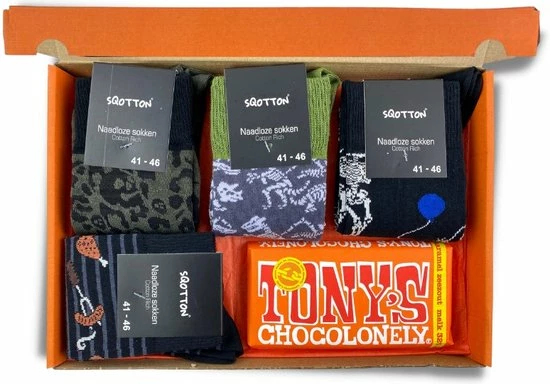 Leuke cadeaubox in de kleur oranje met leuke sluitsticker in de tekst ‘’Warning really good things inside” speciaal voor jou alvast ingepakt. In het cadeaudoosje vind je een lekkere chocolade van Tony’s Chocolonely reep en een set van 4 paar vrolijke printsokken. Dit allerleukste geschenkdoosje zal meer dan voldoen aan je zoektochten. Vooral als je het moeilijk vindt om een leuk cadeautje te vinden voor je vrienden, familie of geliefden. Dit speciale cadeau met vrolijke sokken is geschikt voor zowel dames als voor heren. Verstuur dit brievenbus giftbox als felicitatie, bedankje, beterschap of zomaar. Een feestje door de brievenbus zonder dat de ontvanger thuis hoeft te zijn, want onze brievenbusdozen passen door elke brievenbus superhandig. De sokken zijn verkrijgbaar in maat 36-40 en 41-46.